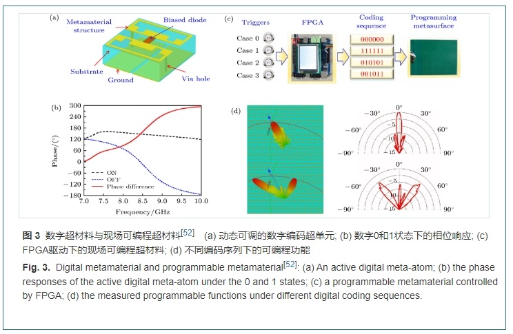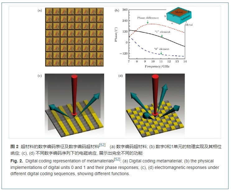 本研究组[61]于2017年在Journal of Materials Chemistry C的特邀论文中提出信息超材料的概念, 涵盖了数字编码超材料、现场可编程超材料以及未来的软件化超材料和可认知超材料, 是物理学与信息科学的有机融合. 信息超材料采用数字化方式对超材料的人工原子进行表征与标定, 从而使人们可以从信息的角度来分析与设计超材料, 它能直接处理数字编码信息, 并可进一步对信息进行感知、理解, 甚至记忆、学习, 为基于超材料的电磁波调控提供了一个全新的物理平台, 从而实现对信息更加灵活、实时和智能地控制. 信息超材料的核心是在超材料的物理空间上建立起数字空间, 可将电磁学和信息科学有机地结合起来, 开拓新的学科方向, 产生一系列具有新体制新机理的信息系统.