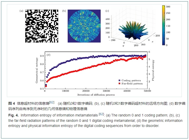 对于信息超材料, 不同的数字编码图案导致不同的物理性能. 例如, 全0或者全1编码超材料产生单波束辐射, 而图4(a)所示的0和1随机编码产生大量的多波束辐射(图4(b)和图4(c)), 后者的信息量明显高于前者. 为了定量地评估信息超材料所辐射的信息量大小, 本研究组[62]提出利用香农信息熵来表征具有不同数字编码图案的信息超材料所携带的信息量, 由此可通过设计不同的数字编码图案来操控信息超材料所辐射的信息量. 数值仿真与理论计算表明, 香农信息熵可用来准确评估信息超材料所携带信息量的大小. 数字编码图案越随机, 其几何熵与远场方向图的物理熵就越大, 并且两者之间存在近似正比关系, 如图4(d)所示. 这恰好与熵在热力学中的原始定义相吻合, 也与香农提出的信息熵定理相一致. 基于信息熵, 可准确地实现具有任意信息量的远场方向图, 为新体制微波成像等奠定基础.