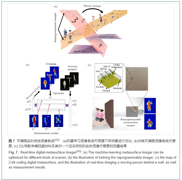 超材料的智能化还体现在其与人工智能算法的结合. 本文4.2节所介绍的基于机器学习算法驱动的动态成像系统是超材料智能化的应用之一[67], 该工作最近又取得新进展. 通过在可编程超材料中嵌入三种机器学习算法所研制的智能超材料, 不仅实现了非合作人体目标生命体征的探测, 而且完成了非合作人体目标的自动微波手语识别, 为解决智慧家庭人机交互、语言障碍人群交流等问题提供了新的途径[92,93]. 相信在不久的将来, 会有更多的深度学习算法和极端学习算法应用于可编程超材料, 以实现更先进的功能.