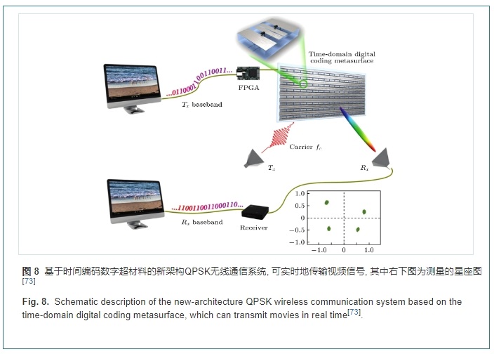 除了使用空间数字编码进行直接通信, 本研究组[71]进一步提出了时间编码超材料的概念, 通过在时间域引入数字编码来控制超材料周期单元, 以可编程方式实现了超材料对电磁频谱的实时动态调控, 以及对不同谐波的精确控制, 并可实现入射能量从载波至高阶谐波的高效转换. 根据2比特梯度时间编码对正负一次谐波的高效产生和实时切换特征, 本研究组基于时间编码超材料构建了一种新的二进制频移键控(binary frequency shift keying, BFSK)无线通信系统构架. 在该构架中, 传统通信系统发射机中所必须的数模转换、混频器、射频链路、天线等部件被超表面和FPGA所取代, 基带信号直接映射为超表面反射系数, 实现了对入射波载波频率的调制. 该系统能够在多角度、有干扰等情形下实现信息的低误码率、高速传输, 极大简化了通信系统的复杂度, 为新一代通信、雷达系统的发展提供了新思路. 由于BFSK通信系统的数据传输速率较低, 又进一步提出和研制了基于时间编码超材料的正交相移键控(quadrature phase shift keying, QPSK)[72,73]、8移相键控(8-phase shift keying, 8 PSK)[74,75]以及多种机制混合[76]的无线通信系统. 其中, QPSK超材料无线通信系统架构如图8所示, 在主频为4 GHz的情况下, 其数据传输速率已达1.6 Mbps, 可实时、无误码地传输视频电影[73].