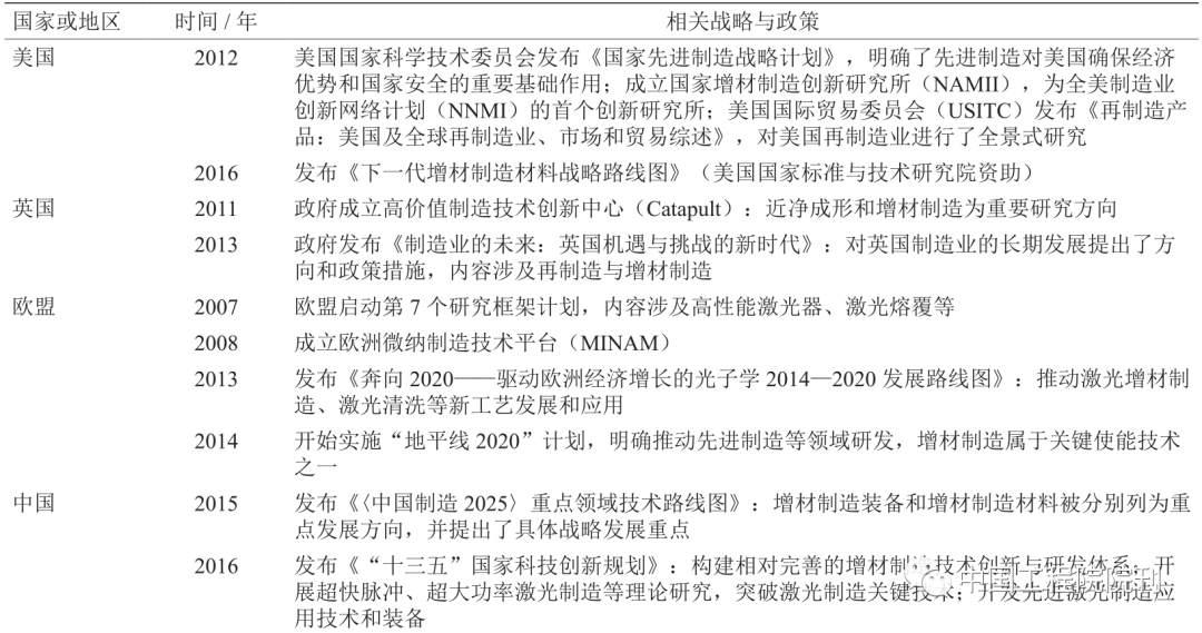 表1 世界主要国家或地区激光再制造技术及产业相关战略与政策